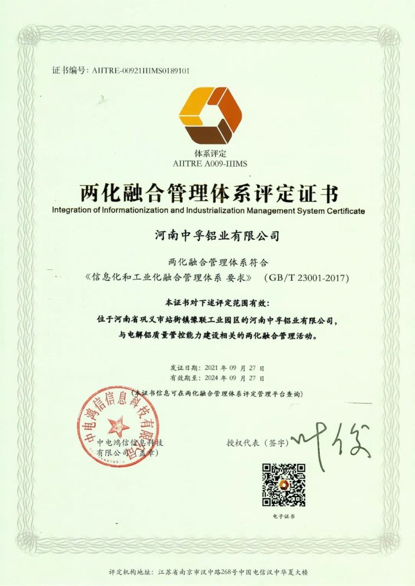 日前,中孚鋁業公司獲得了由國家工信部核定、授權評定機構頒發的《兩化融合管理體系評定證書》,標志著中孚鋁業公司在推進信息化和工業化融合方面取得了顯著成效。